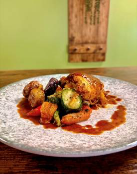 Tender chicken thigh, stuffed with fragrant herbed rice and slow-roasted to perfection. Served with natural au jus, seasonal roasted vegetables, and golden potatoes.