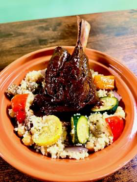 Biblical-style baked lamb shank served with couscous, garbanzo beans,