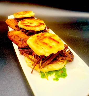 Three mini crispy arepas served with carne mechada (shredded beef),