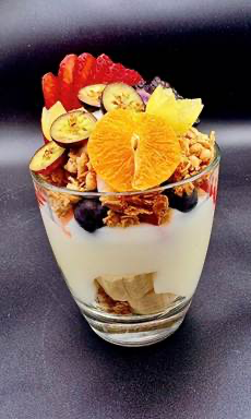 Vanilla yogurt, banana, strawberries, blueberries, granola,
