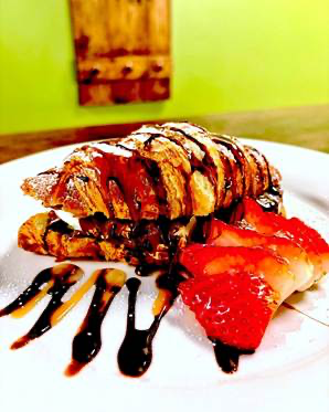 Sourdough bread croissant baked with eggs, cream, vanilla, chocolate, sugar, and coffee.