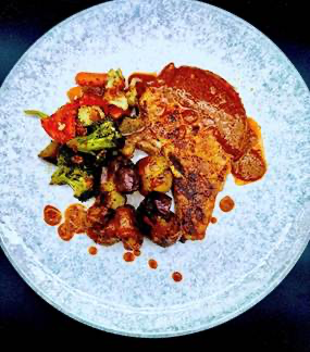 Juicy 12oz bone-in pork chop marinated in Mediterranean spices, accompanied by roasted seasonal vegetables, smashed potatoes, and finished with a natural mustard au jus.