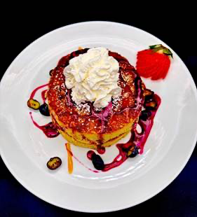 Two thick, golden griddles made to order, served warm with silky syrup, a dusting of powdered sugar, and a cloud of whipped cream.