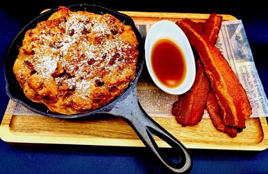 Flaky sourdough croissant baked to golden perfection with eggs, cream, vanilla, chocolate, and a hint of coffee. Served warm with crispy bacon and drizzled with rich syrup